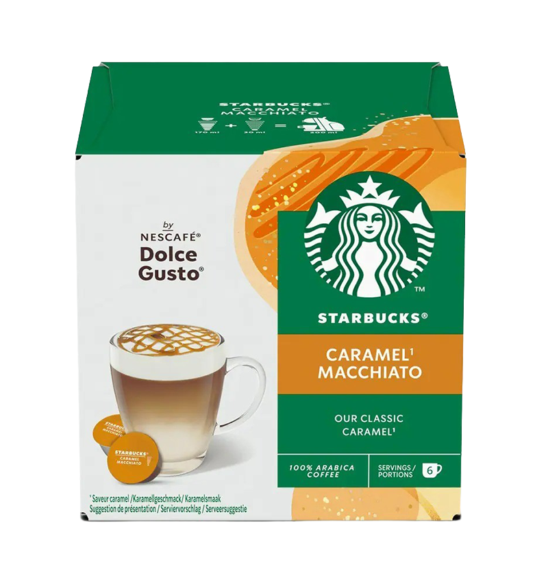 Enjoy the iconic, creamy taste of STARBUCKS® Caramel Macchiato, designed for NESCAFÉ® Dolce Gusto® machines.